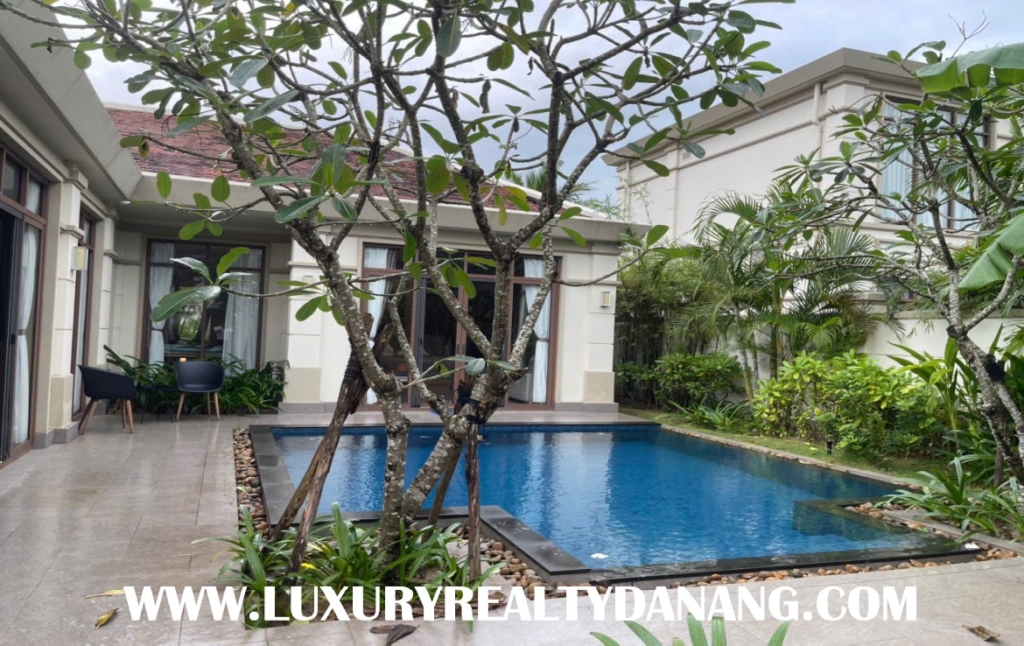 The luxurious villa is situated in Fusion resort and villas where may be one of the most luxury villa compounds in Danang beachside, Vietnam. Living here, it can bring you all high- end standards of a classic living, and you can walk on the white sand dunes and admiring the pure beauty of Danang beach at night. Fusion villa is located along the romantic coastline, and in the central position among Danang city and Hoi An Ancient Town. In addition, the villa compound is just near BRG golf club, and other luxury villa areas such as: Ocean Estate villa and Ocean villas. All villas in Fusion most meet the most modern design following with European style. So, living here, tenants can enjoy a romantic walk on the beach, a host of activities or simply relax in the private beach cabanas. Especially, you can enjoy spectacular views toward the East Sea, Cham Islands, and Marble Mountains as well. Danang Fusion villa rental consists of one floor, the land area of 400 square meters, the usable area of 210 square meters, the garden view, and a cool swimming pool with greenery surroundings. Besides, the villa also comprises of one bedroom with the luxury ensuite bathrooms and an extra king- size bed fully high- end furniture. The rental is US$2,200/month, including the management fee and the cleaning fee of the swimming pool.