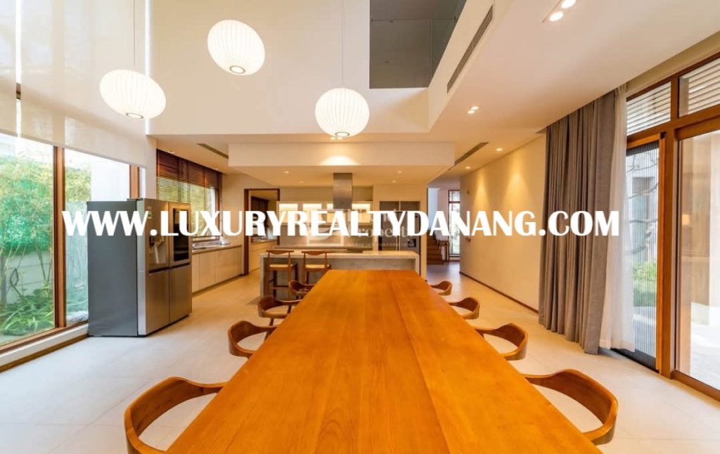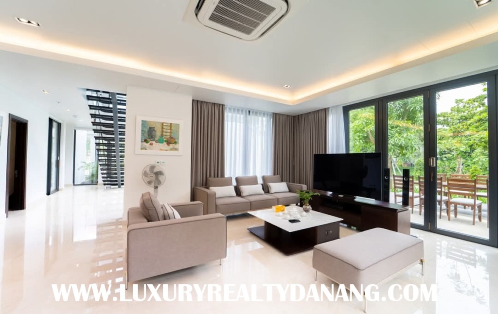 This luxury villa belongs to the luxurious villa compound- Ocean Villas. It is one of the largest integrated resort developments on Vietnam’s Central Coast and VinaCapital’s award-winning flagship resort. The Ocean Villa resort features 114 luxuriously appointed villas and 116 suites, a world class golf course and including many other amenities. Addition, it receives the awarding 5 stars by the Vietnam National Administration of Tourism (VNAT). Ocean villas compound is located in Ngu Hanh Son district, Danang city, Vietnam, in the convenient way to drive to Hoi An Ancient Town. Moreover, it is among five- star resorts and villas such as: Ocean Estates, The Dunes, The Point residences and near BRG international golf course. Danang Ocean villa rental consists of two floors, the usable area of 433 square meters, the land area of 1000 square meters, four furnished bedrooms, a garage for parking. Besides, the villa also includes a private swimming pool and a large garden with grasses and lush trees around. The rental US$4,100/month, including the management fee.
