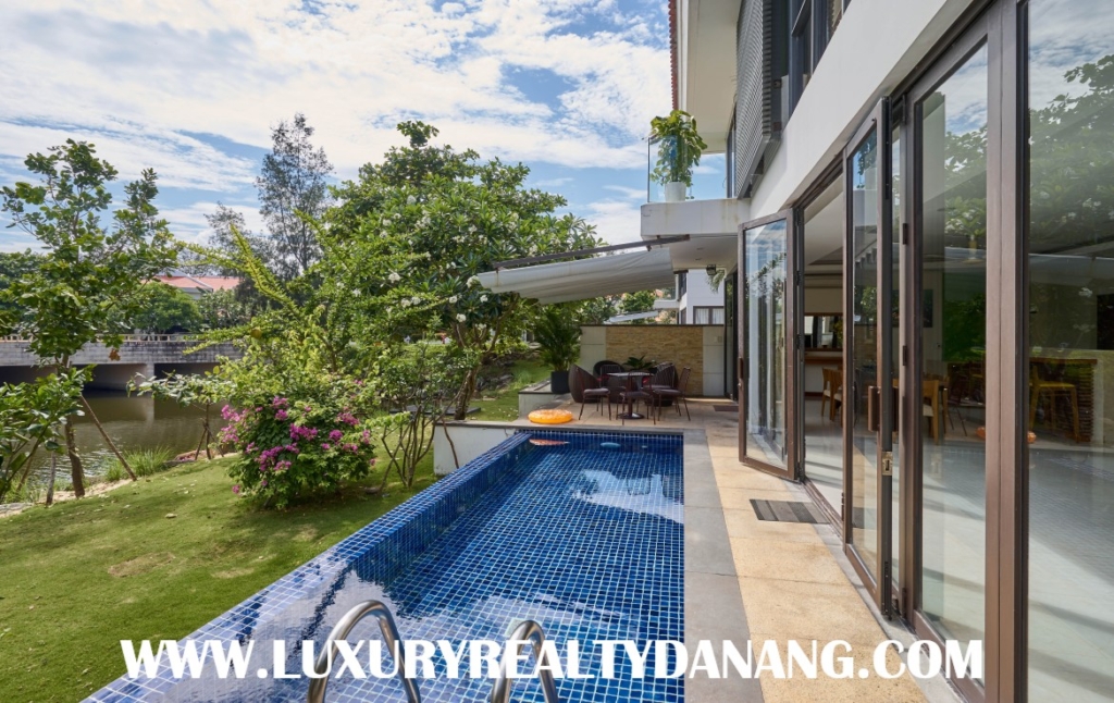 This luxurious villa belongs to Ocean Villas where is one of the largest integrated resort developments on Vietnam’s Central Coast and Vina Capital’s award-winning flagship resort. The Ocean Villa resort features 114 luxuriously appointed villas and 116 suites, a world class golf course and including many other amenities. Addition, it receives the awarding five- stars by the Vietnam National Administration of Tourism (VNAT). Ocean villas compound is located in Danang city, Vietnam, just in the short distance to the beautiful beach bay. In addition, you can find it convenient to drive to Hoi An Ancient Town. Moreover, it is among five- star resorts and villas such as: Ocean Estates, The Dunes, The Point residences and near BRG international golf course. Luxury beach villa in Danang consists of two floors, the usable area of 433 square meters, the land area of 1000 square meters, four open bedrooms, a garage for parking. Besides, the villa also includes a private swimming pool towards the front river and a green garden surrounding with grasses and lush trees. The rental US$4,100/month, including the management fee.